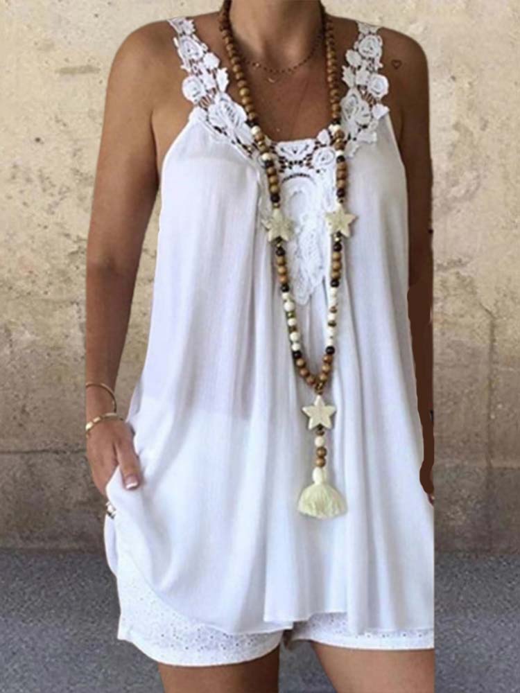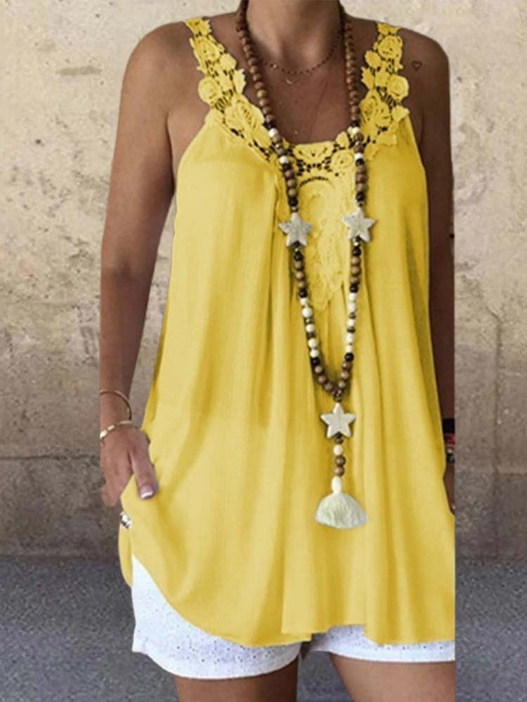 No te pierdas esta camisa de tirantes, confeccionada con un tejido suave y ligero que se adapta a tu figura. Esta camisa tiene un diseño de encaje de Color puro que le da un toque de elegancia y sensualidad, y un cuello redondo que realza tu escote.
