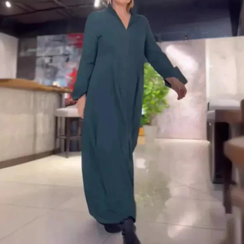 Imagina caminar a lo largo del día con suave elegancia con el vestido Eva, un vestido largo que ofrece estilo y comodidad. Adecuado para cualquier ocasión, este vestido no es solo una bonita elección de vestuario, sino también un regalo que hará las delicias de quien lo reciba.