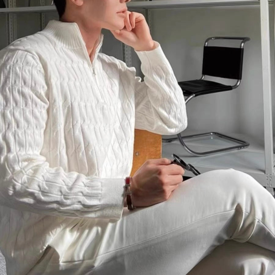 Este suéter para hombre es una obra de intrincada artesanía, confeccionado con algodón de la más alta calidad que se siente notablemente suave. Tiene un tejido de cable ondulado meticulosamente trabajado para un estilo visualmente atractivo, con un cuello alto y mangas largas. El cierre parcial con cremallera le otorga modernidad, elegancia y sofisticación interminable.